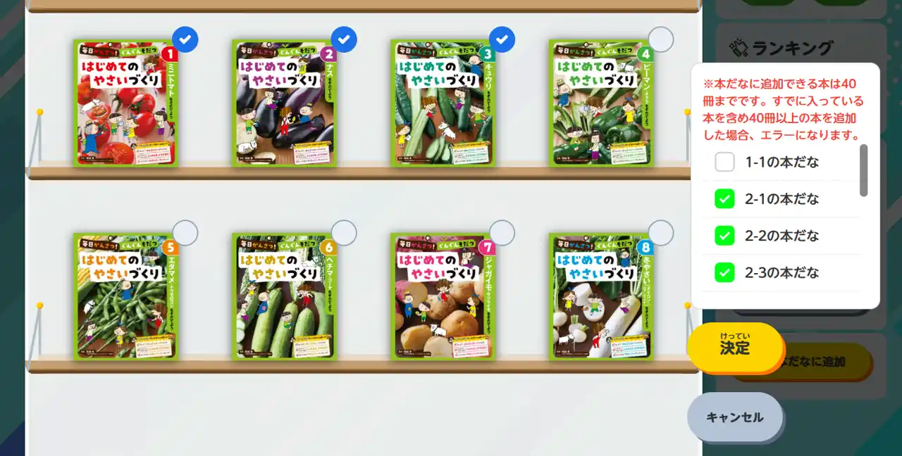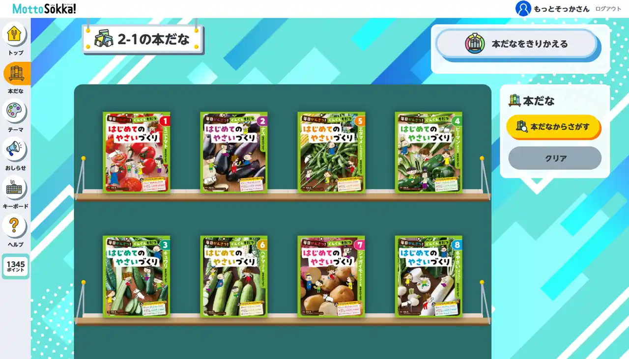 児童生徒は、「本だなをきりかえる」のボタンをクリックすることで、自分が所属するクラスや特別支援学級、そして学校全体の本だなを閲覧することができます。低学年の児童であっても、簡単な操作だけで先生が用意した本に迷わずたどり着くことができるようになりました。 |