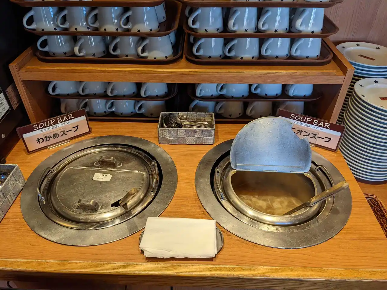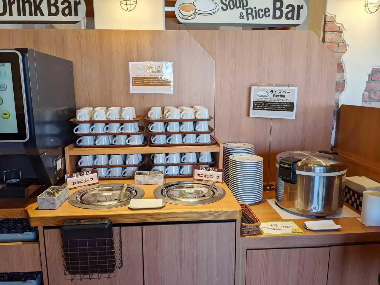 お客様の気分やお腹の具合に合わせて、 ライスの量を自由に調整していただけるセルフスタイルのライスバーと、 温かいスープをお楽しみいただけるスープバーをご用意しております。 |