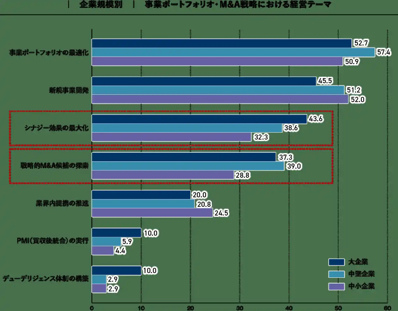 事業ポートフォリオ・M&A戦略では、「事業ポートフォリオの最適化」と「新規事業開発」がすべての企業規模で高水準となっており、既存事業の見直しと成長分野への展開が共通の関心事項であることがわかります。短期的な業績対応にとどまらず、中長期的な成長を見据えた事業構成の再検討が進められております。企業規模別に見ると、大企業・中堅企業では「シナジー効果の最大化」(大企業43.6%・中堅企業38.6%)や「戦略的M&A候補の探索」(大企業37.3%・中堅企業39.0%)が高く、M&Aを成長戦略の一手段として位置づける動きが見られます。一方、中小企業では資金・人材面の制約を背景に「新規事業開発」(52.0%)や「業界内提携の推進」(24.5%)を通じた内部成長への関心が示されております。 |