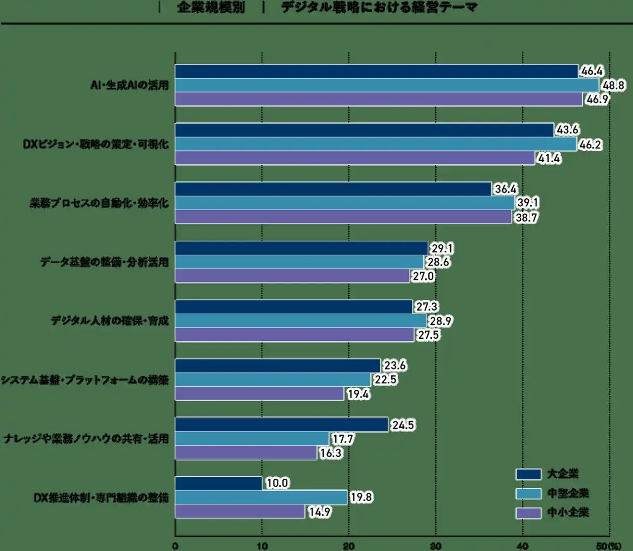 (3)デジタル戦略における経営テーマでは「AI・生成AIの活用」が全企業規模で最上位となり、大企業46.4%、中堅企業48.8%、中小企業46.9%といずれも高水準となっております。 |