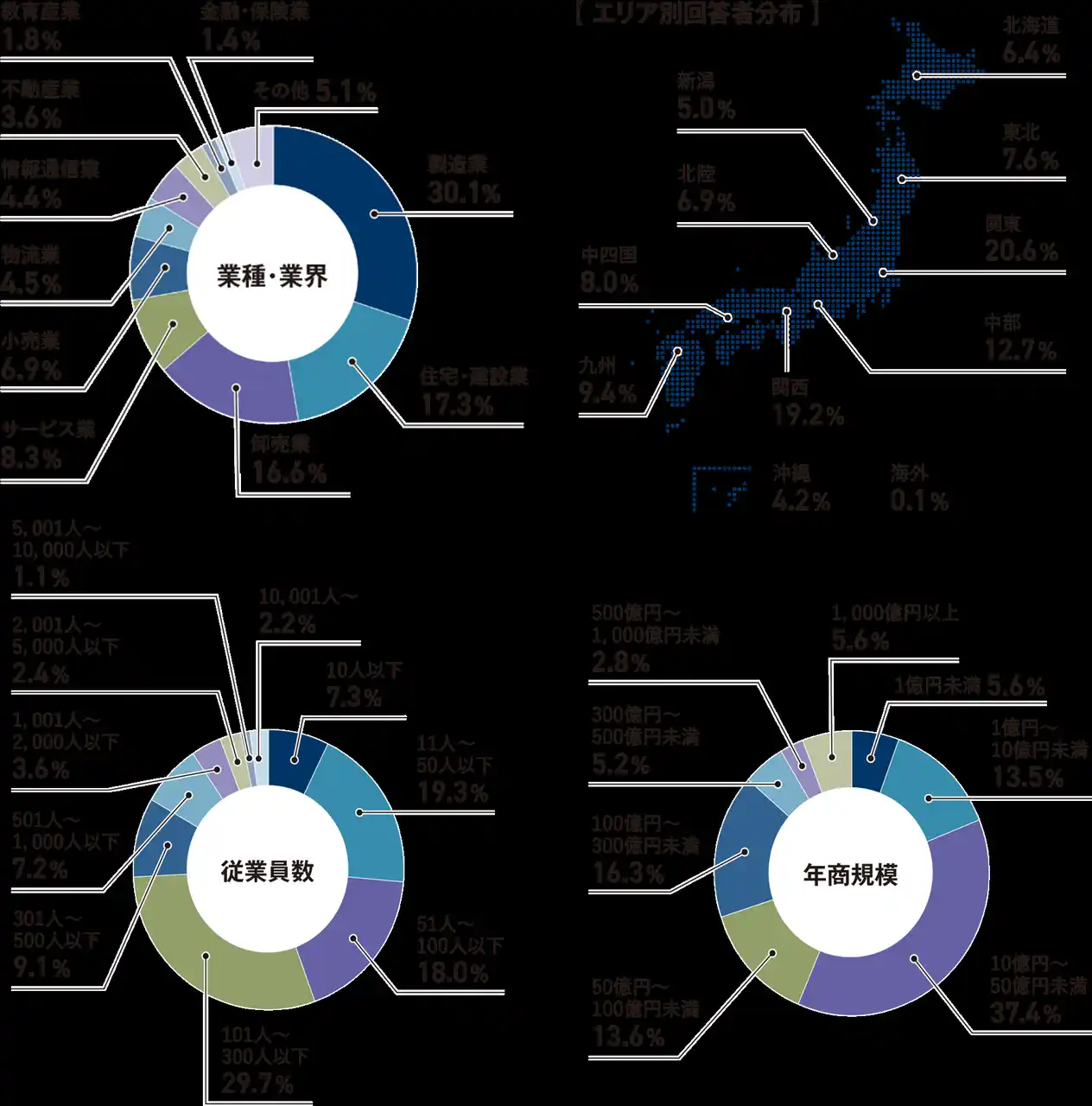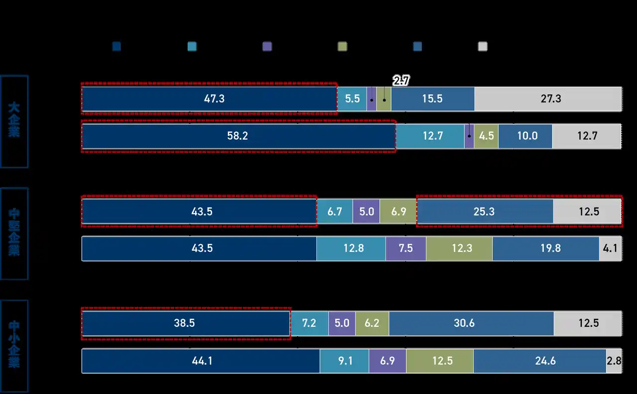 ※本調査では、アンケートにご回答いただいた企業において、従業員規模が2,001人以上の企業を大企業、100人超~2,000人以下の企業を中堅企業、100人以下の企業を中小企業として分類し、分析を行いました。 |