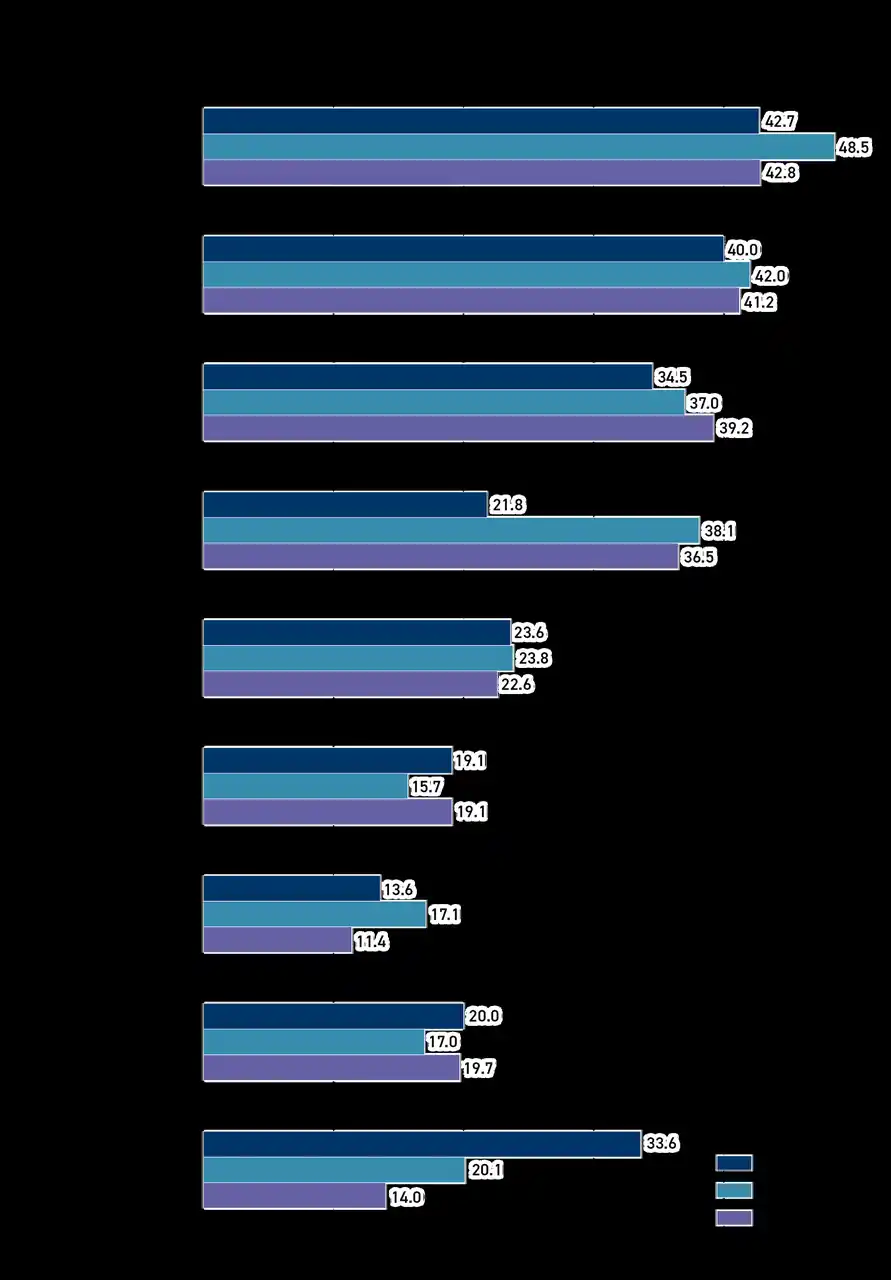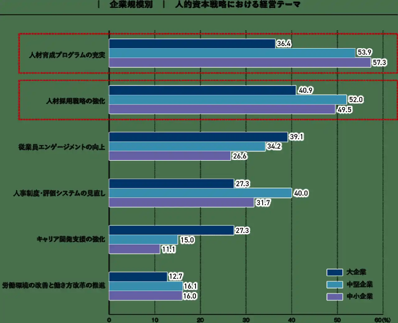 人的資本戦略における経営テーマを見ると、企業規模を問わず「人材育成プログラムの充実」や「人材採用戦略の強化」が上位に挙げられており、人材の確保と育成が引き続き経営の重要課題として位置づけられております。特に中堅企業(人材育成53.9%、人材採用52.0%)および中小企業(人材育成57.3%、人材採用49.5%)で高水準となっており、人的基盤の強化が成長や安定経営の前提条件として認識されていることがうかがえます。
