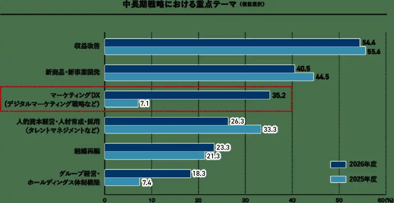 (2)中長期戦略の重点テーマでは「収益改善」が54.4%で最多となりました。注目すべきは「マーケティングDX」で、前年の7.1%から35.2%へ大幅に上昇しており、成長戦略における顧客接点の高度化への関心が急速に高まっております。 |