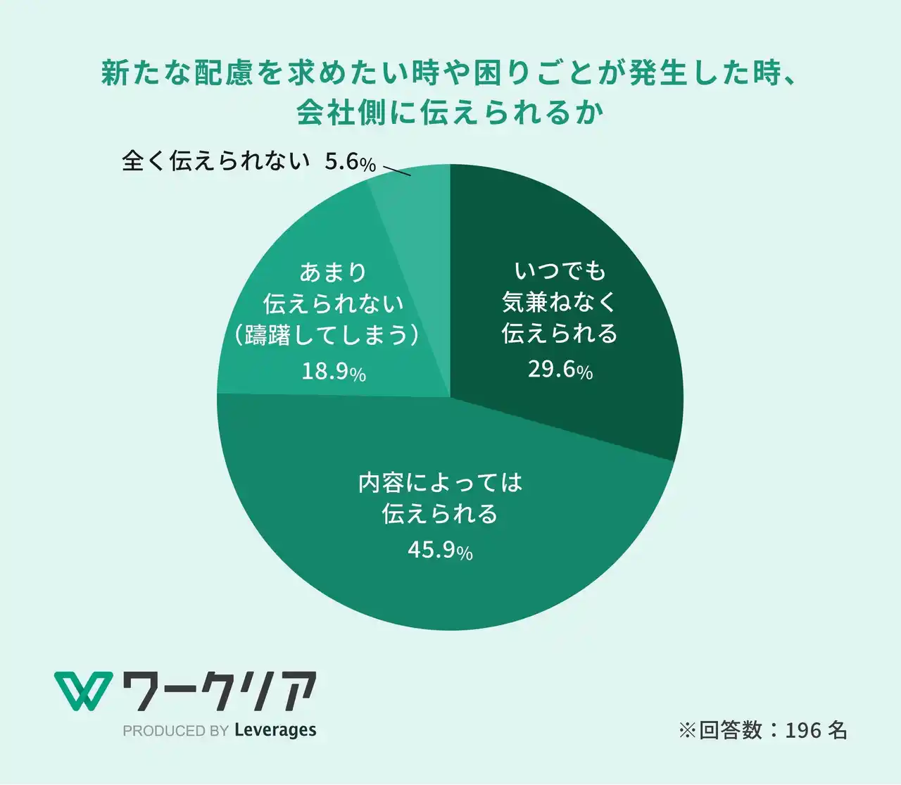 新たな配慮を求めたい時や困りごとが発生した場合について、約8割は会社側に「伝えられる(75.5%)*5」と回答した一方で、未だ約4人に1人は「躊躇してしまう(18.9%)」「伝えられない(5.6%)」と回答しました。 |