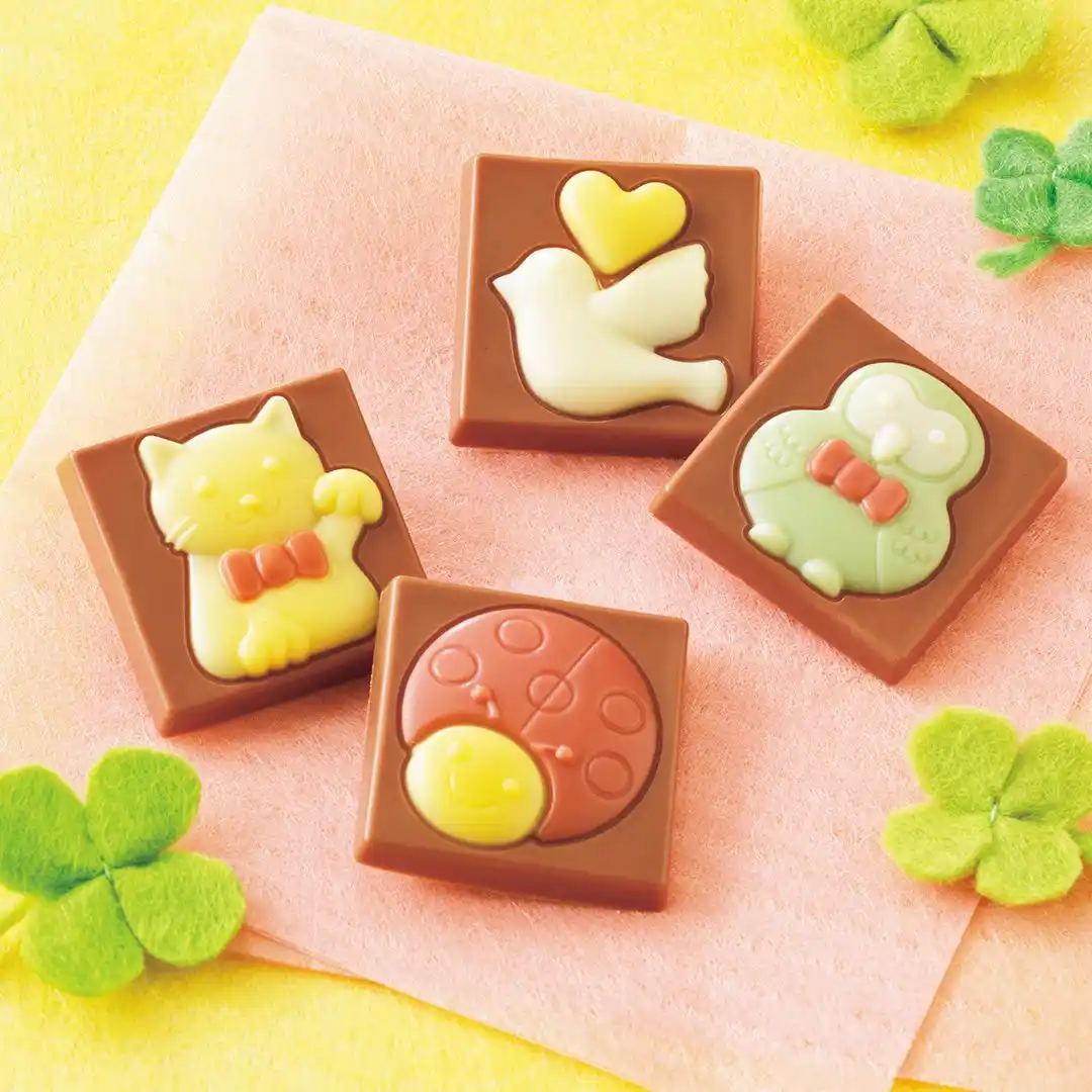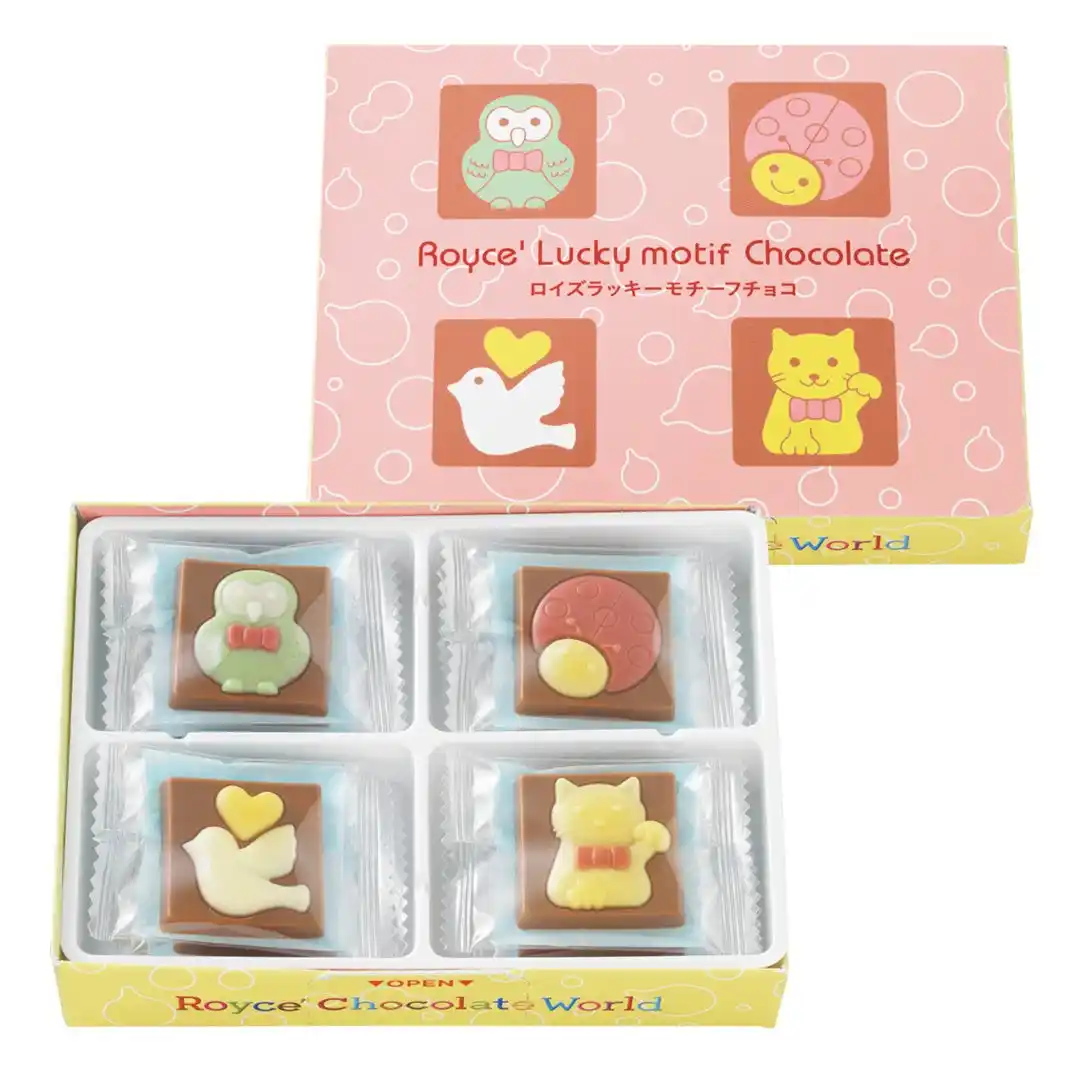 | 幸運の象徴とされる4つの生き物やアイテムをモチーフにしたひと口サイズのチョコレート。ストロベリー風味のクリームをまろやかなミルクチョコレートで包み、フクロウ・てんとうむし・ハト・招き猫の4種をデザインしました。通常は新千歳空港3階のロイズ チョコレートワールド限定販売ですが、期間限定で公式オンラインショップでも販売します。 | |||||||||