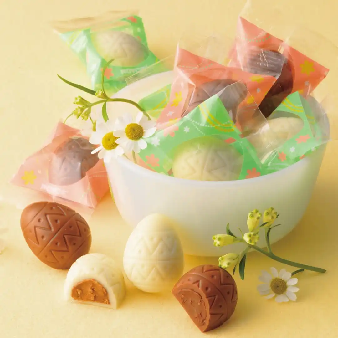 | イースターのモチーフをデザインした限定ボックスに、卵の形をしたひと口サイズのチョコレートを詰め合わせました。ココア風味のクリームをミルクチョコレートに閉じ込めた[ミルクショコラ]と、アーモンドプラリネのクリームをホワイトチョコレートに閉じ込めた[ホワイトショコラ]の2種類の味わいです。食感の良いクッキークランチがアクセントになっています。 | |||||||||