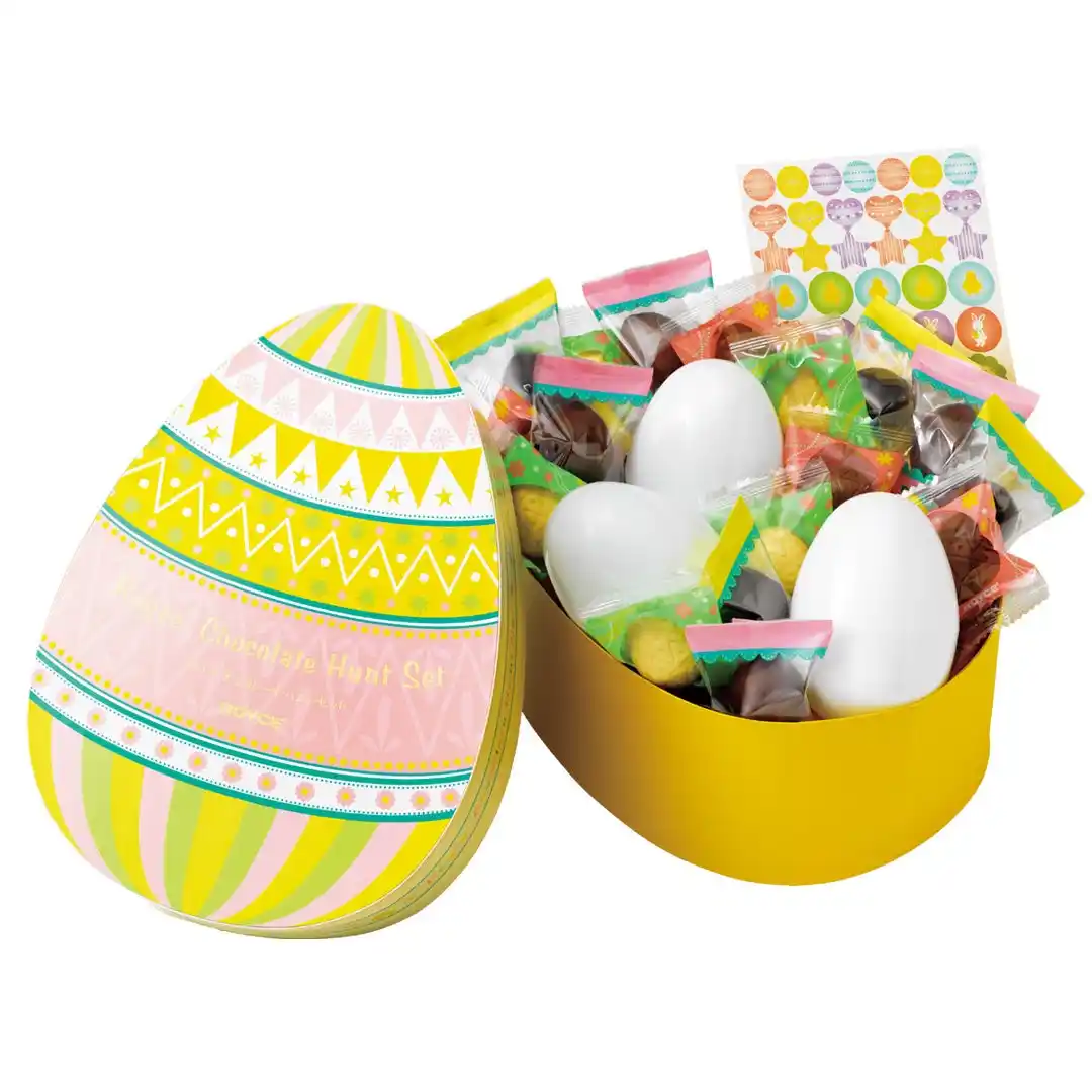 | にぎやかなデザインの卵型ボックスに、イースター限定のひと口ショコラを4種類詰め合わせました。卵型ケースやデコレーションシールも一緒になった、イースターに行われるゲームのひとつ「エッグハント」をお楽しみいただけるセットです。 | |||||||||
