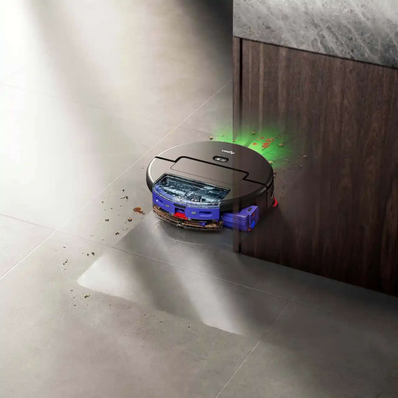 Ai」は汚れを検出し、障害物を正確に回避しながら、床の掃除機がけと水拭きを同時に行うことができます。このロボットは、ゴミやベタつきなどの汚れをリアルタイムで検知し、常に最適な掃除方法に自動調整します。一度汚れを検出すると、HDカメラで状況を確認しながら、その場所が完全にきれいになるまで、最大15回の集中的な掃除を行います。*¹ さらに、ウェットローラーは移動中も常に温水で水拭きを行い、壁際まで徹底的に掃除するので、仕上がりは常に完璧です。」 |
