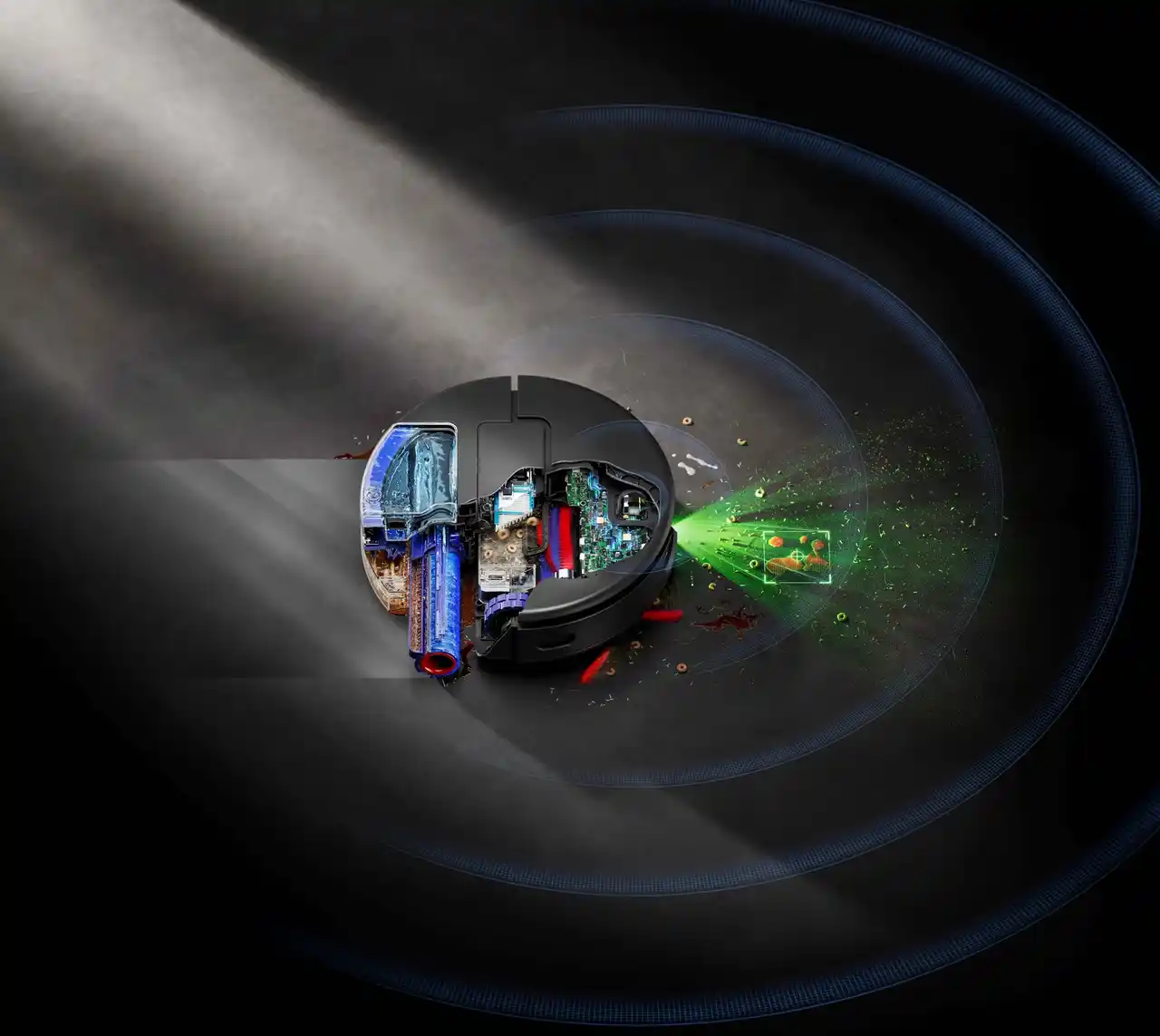 高度なAiで、隠れた汚れまで除去 AiカメラとグリーンLEDの組み合わせにより、家中の約200種類の汚れや障害物を識別。汚れの状態を分析し、除去されるまで繰り返し掃除します。*¹ |
