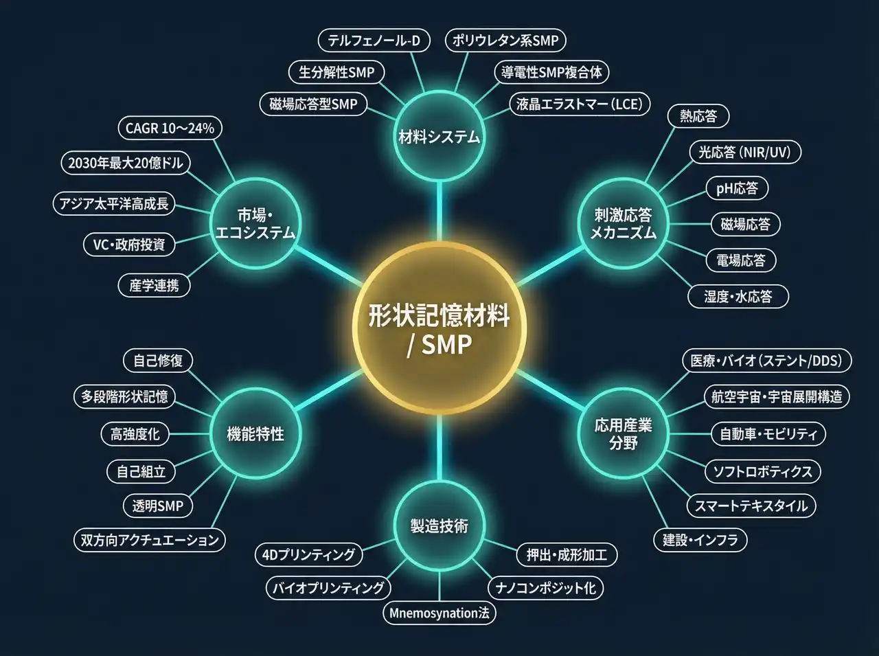 温度・光・磁場・pH・電場への多段階応答と、自己修復・双方向アクチュエーション・透明性・導電性を単一プラットフォームに統合した「多機能形状記憶材料」の開発が、次世代差別化の核心となる。液晶エラストマー(LCE)×SMPハイブリッドや磁場応答型SMP(磁性ナノ粒子内包)などの先端材料系への早期投資が推奨される。 |