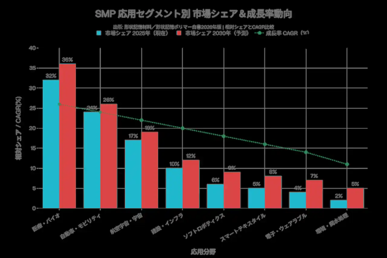 SMP市場で最大成長セグメント(CAGR約26%)である医療分野を最優先ターゲットとして設定する。体温応答型ステント・自己展開カテーテル・DDS複合体については、規制(FDA/CE)対応のタイムライン設計と並行して臨床Proof-of-Concept(PoC)を前倒しで進める。Shape Memory Medical社による2024年のシリーズC調達(3,800万ドル)は、市場成熟の重要シグナルである。 |