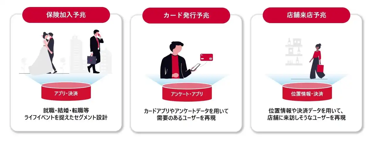 | 更に「生活者のリアルな動き」を反映したドコモデータ群とドコモ独自のAIエンジン「docomo Sense(R)」の高度な拡張機能を活用することで、各業種・商材に特化した「購買・行動予兆セグメント」を作成するなど、生活動線に根ざした独自のデータ活用により、ユーザーのアクションを予測し最適なタイミングでのアプローチを実現します。 | |||