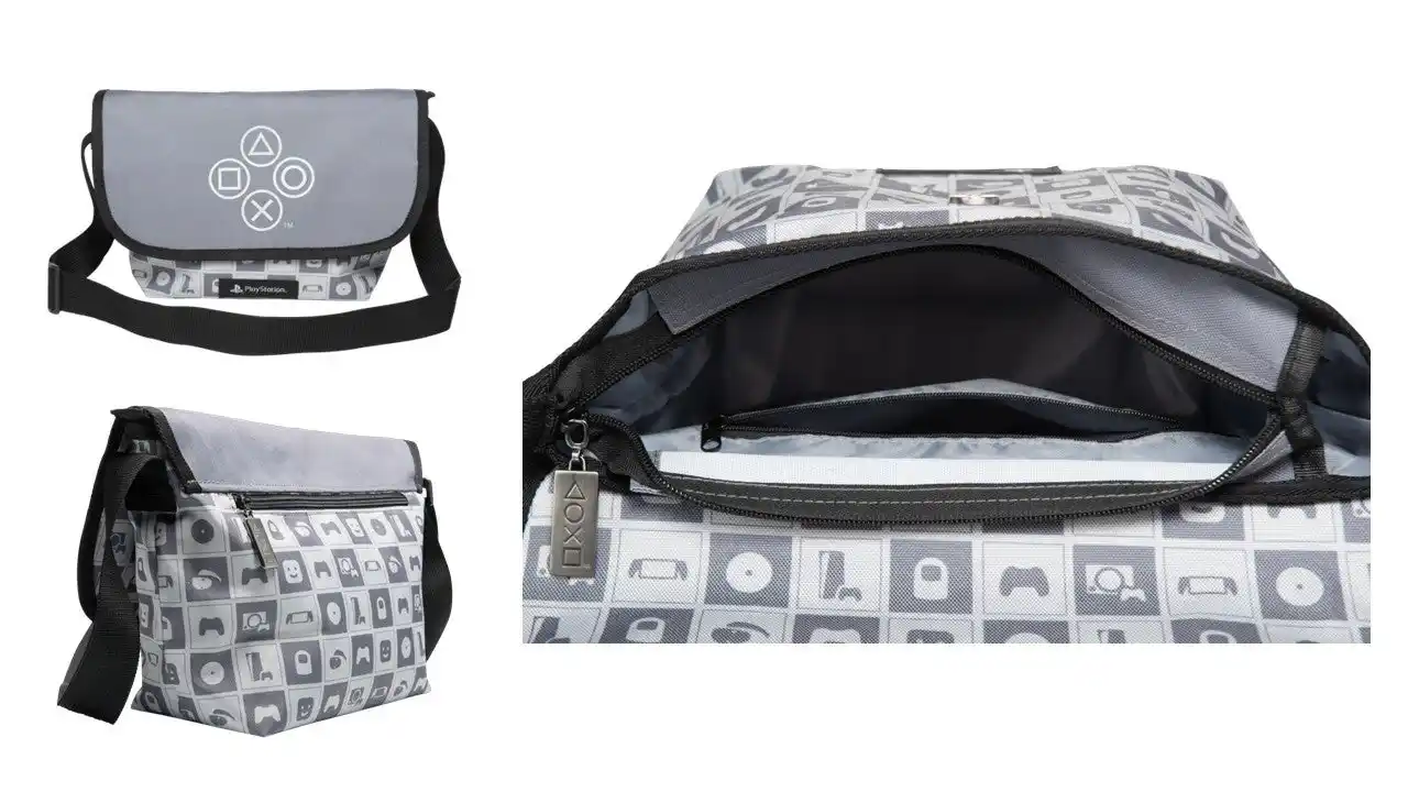 メッセンジャーバッグは、PlayStation(TM)の歴代ハードウェアのモチーフを全体に並べたデザイン。500mlペットボトルや折り畳み傘が収納できるサイズで、小物用のポケットも充実。 |