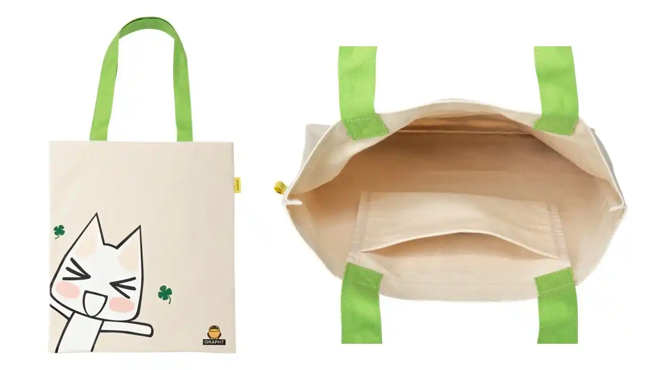 薄手で軽いキャンバス地のトートバッグです。A4書類やノートPCがすっきり収まり、通勤・通学のサブバッグとして活躍します。グリーンのハンドルと四葉のクローバーが映える、春先のコーディネートに取り入れたくなるデザインです。 |