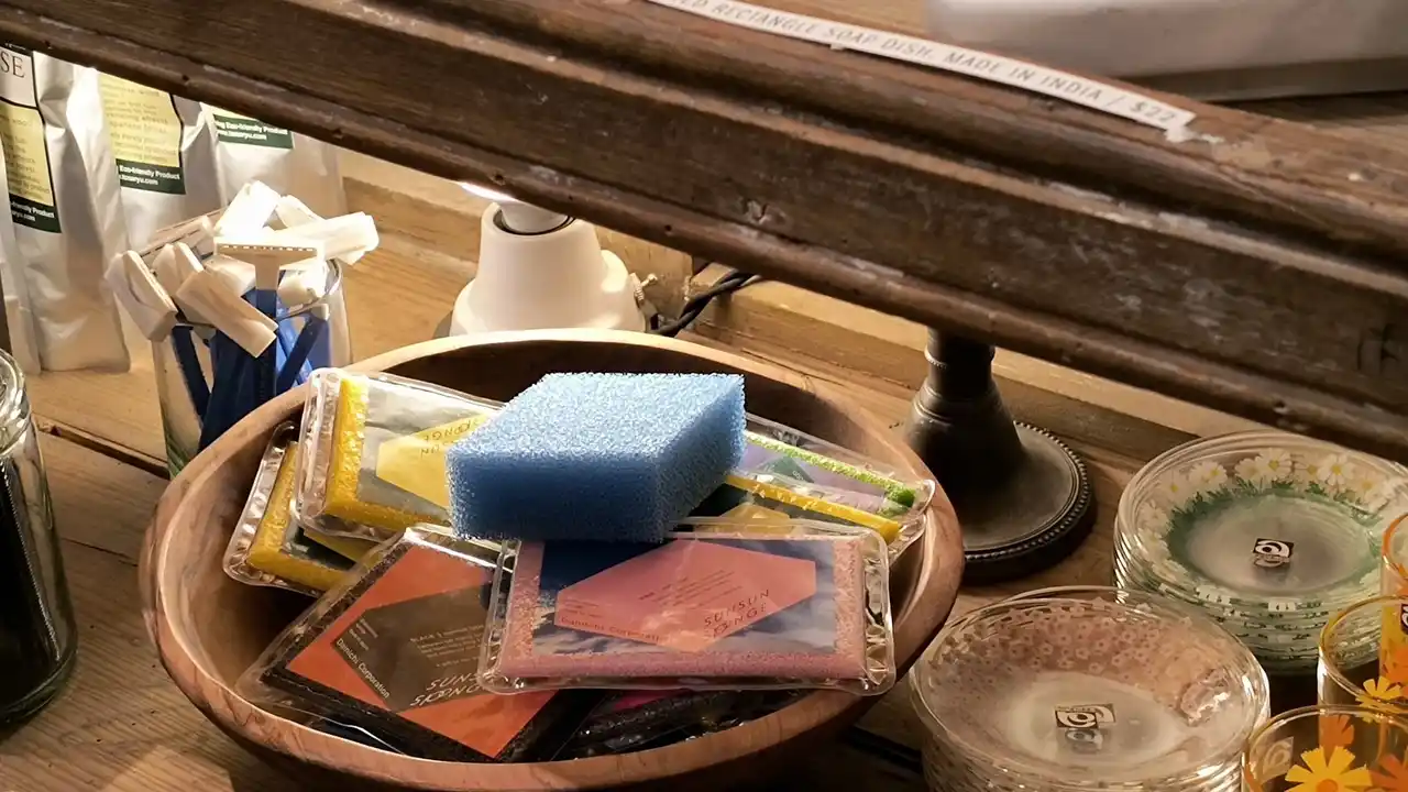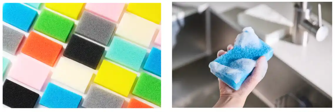 ダイニチ・コーポレーションは創業から、食器洗い用固形洗剤の製造販売を行っています。製造から販売を行う中で、固形洗剤と相性の良いスポンジを研究し、高品質ポリウレタンを使用した、従来のスポンジの概念を覆す「サンサンスポンジ」が生まれました。半年以上使えるほど丈夫で長持ちなので、ごみの削減に。 |
