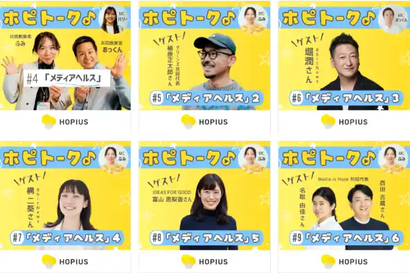 | ホピアスは「メディアヘルス」という概念を提唱・啓発する活動をスタートしました。日々触れる情報は、人の思考や行動、社会の空気を大きく左右します。 不安や対立を煽る情報だけでなく、希望や可能性を示す情報を届けることが、社会にとって重要だと考えています。ホピアスは、読者やメディア関係者の皆さんとともに、情報空間をより健全で、社会を前向きに後押しするものにしていく運動を広げていきます。メディアヘルスについては「ホピトーク」にて発信しています。こちらもぜひご視聴ください。 Spotifyで配信中!→こちら | |||||||||