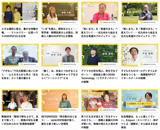 | 取材対象も、国内外の社会起業家、NPO、研究者、国際機関など幅広い分野に広がっています。また、ホピアスに関する様々なテーマをラジオ形式で語り合う、Spotifyコンテンツ「ホピトーク」も開始し、累計視聴時間は144時間にのぼりました。忙しい日常の中でも希望の情報に触れられる機会を広げています。 | |||||||||