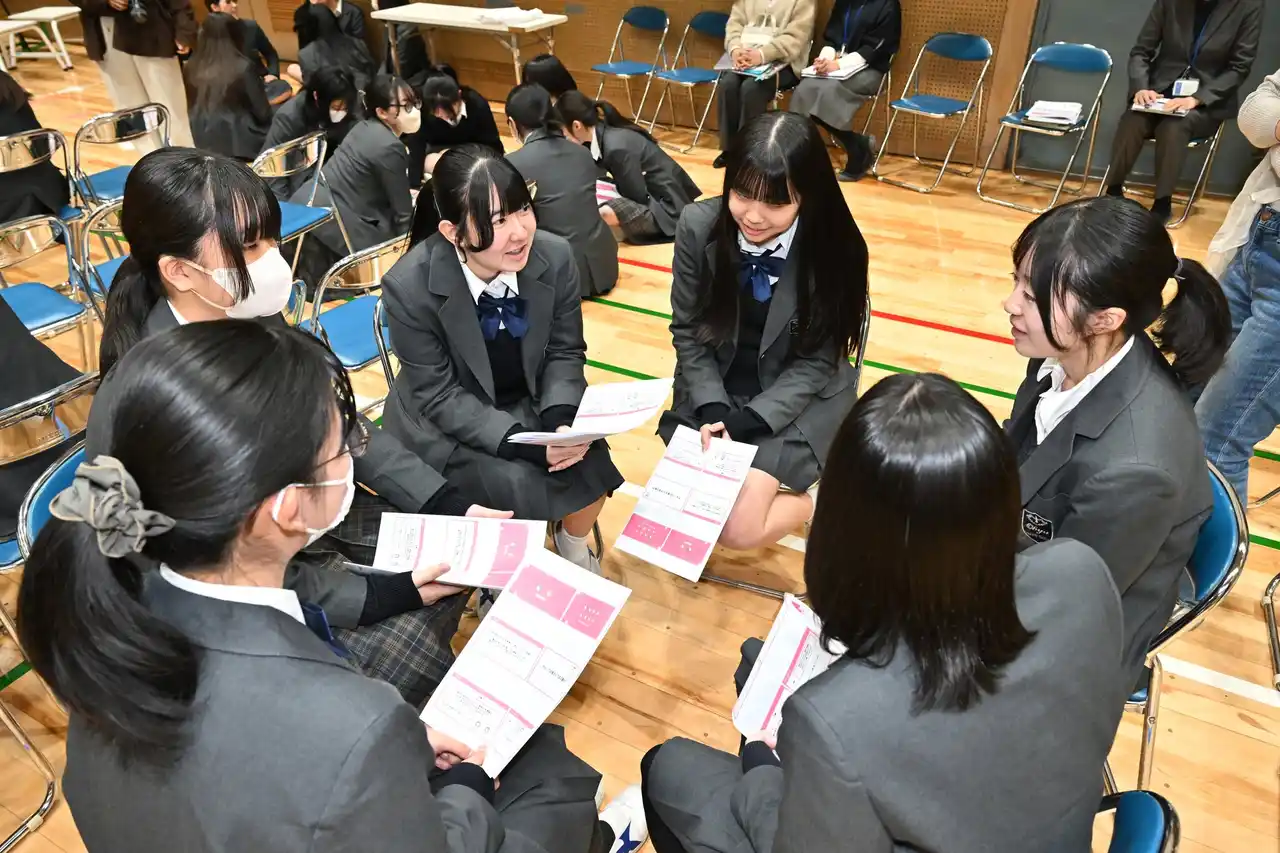 次に、講義を踏まえ、学校生活の中で起こりうる場面を設定し、「仲の良い友人がつらそうにしながら教室にいたら、あなたならどうしますか?」というシナリオでグループに分かれてディスカッションを行いました。生徒からは「声をかけてカイロやブランケットを貸す」「移動教室なら、荷物を持ってあげる」といった直接的なサポートのほか「気分が紛れるよう楽しい話をする」「一緒に軽いストレッチをする」など、友人ならではの細やかな配慮が詰まった具体的な意見が活発に交わされました。