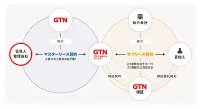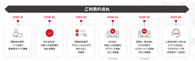 「GTN Fair Lease」は、GTNグループのGTNコンシェルジュサービス(GCS)が貸主からお部屋を賃借(マスターリース)し、外国人入居者に転貸契約(サブリース)を結ぶことで、個人契約によるGTNの家賃保証サービスを直接導入しない場合でも、外国人入居希望者への対応を円滑に進められる環境づくりを支援するサービスです。審査・多言語サポート・生活フォローなど、外国人受入れに必要なサポートをGTNグループ内で一気通貫に提供いたします。 |