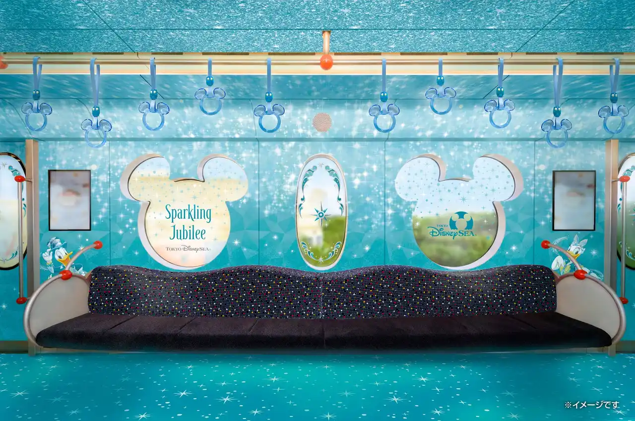 東京ディズニーシー25周年の衣装を身にまとったミッキーマウスと仲間たちが描かれた、東京ディズニーシー25周年を記念した期間限定デザインのラッピングモノレール。車内はジュビリーブルーをベースにキャラクターや華やかな装飾で彩られ、つり革も25周年仕様のデザインに変わり、車内はきらめきであふれます。 |
