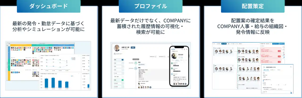 国内大手法人の3社に1社※が利用する統合人事システム「COMPANY」シリーズが提供する、日本企業固有の組織ニーズへ最適化したタレントマネジメントシステムです。人的資本経営に欠かせない人材の可視化、評価、育成、異動・配置、要員計画といったあらゆる機能を網羅しています。HR特化型生成AIの搭載と、現場の従業員から経営層までが迷わず操作できるUI/UXにより、はたらくすべての人が活用できる「COMPANY Talent Management」シリーズとして、組織の意思決定と個人の成長を同時に加速させます。 |