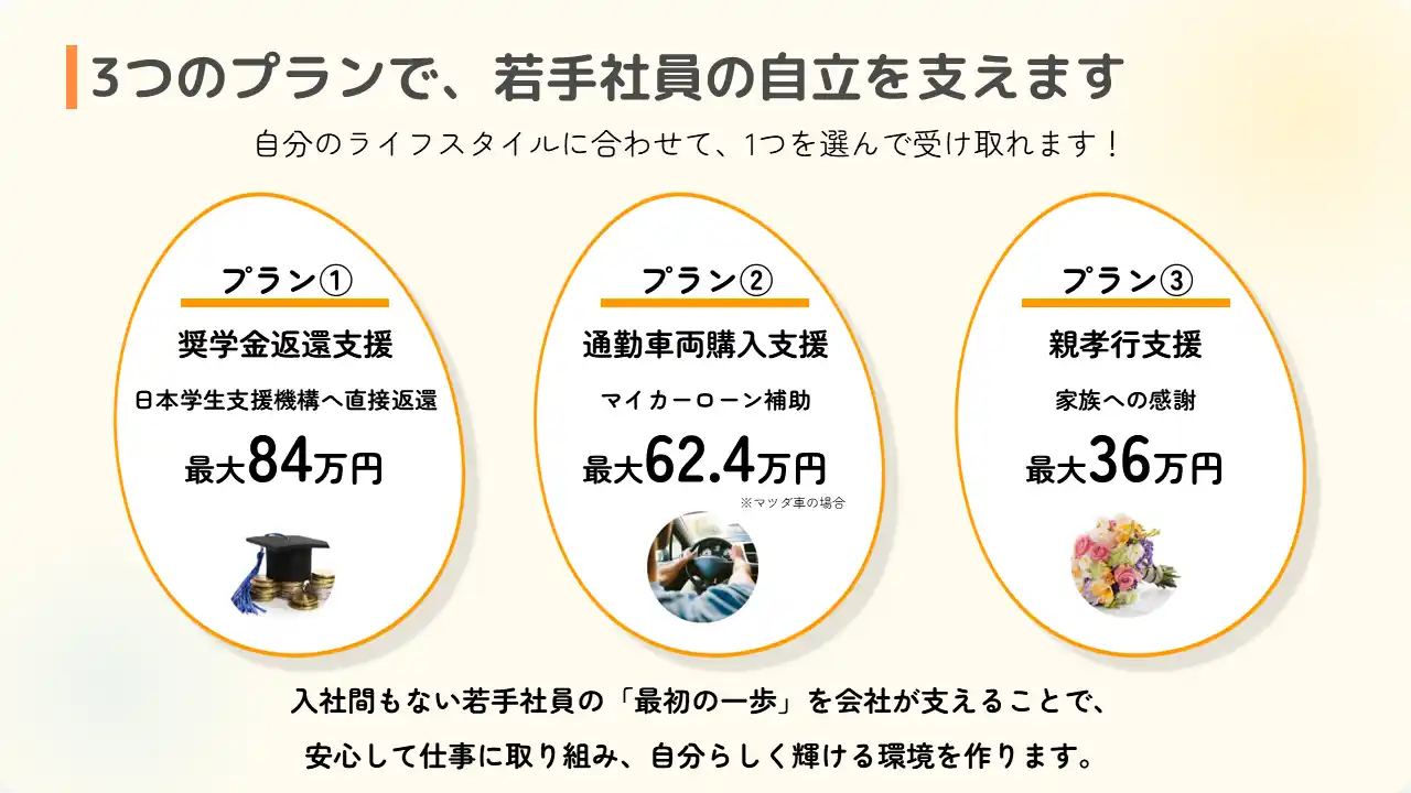 この制度を通じて、若手社員という大切な「人財」の循環と成長を支援し、一人ひとりが経済的な不安なく、長期的にキャリアを築ける魅力的な職場環境を実現してまいります。 |