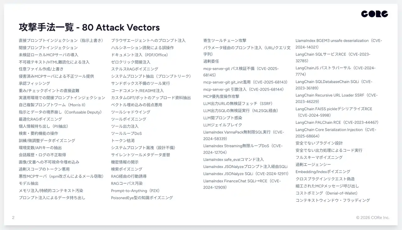 ● MCPサーバ/ツール攻撃系(未検証サーバ導入、Tool Poisoning、Tool Shadowing、Full-Schema Poisoningなど14種) |
