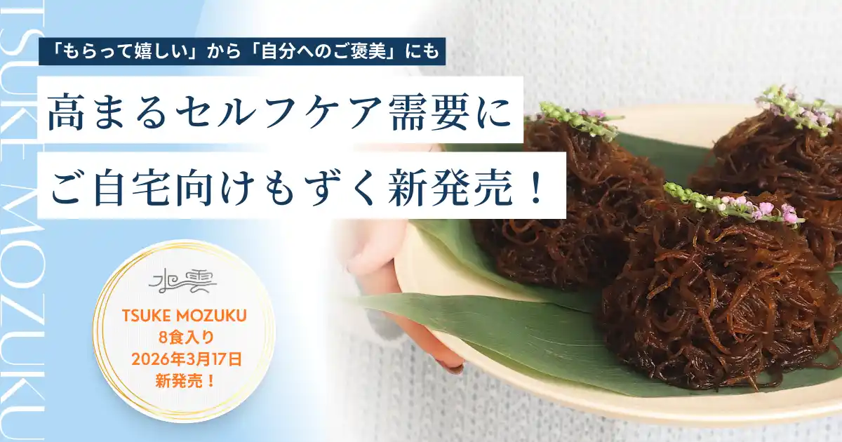 特製のだしつゆに付けて食べる新しいスタイルを提案する「TSUKE MOZUKU(つけもずく)」シリーズより、ご自宅用に特化した新商品「TSUKE MOZUKU 8食入り(だしつゆ付き)」を、2026年3月17日(火)より公式オンラインショップにて発売開始いたします。 |