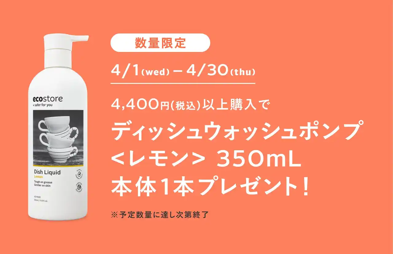 2026年4月1日(水)から4月30日(木)、エコストアオフィシャルオンラインサイトおよびアトレ恵比寿店にて、4,400円(税込)以上お買い上げの方にディッシュウォッシュポンプ<レモン>350mL本体を1本プレゼントするキャンペーンを開催いたします。 |
