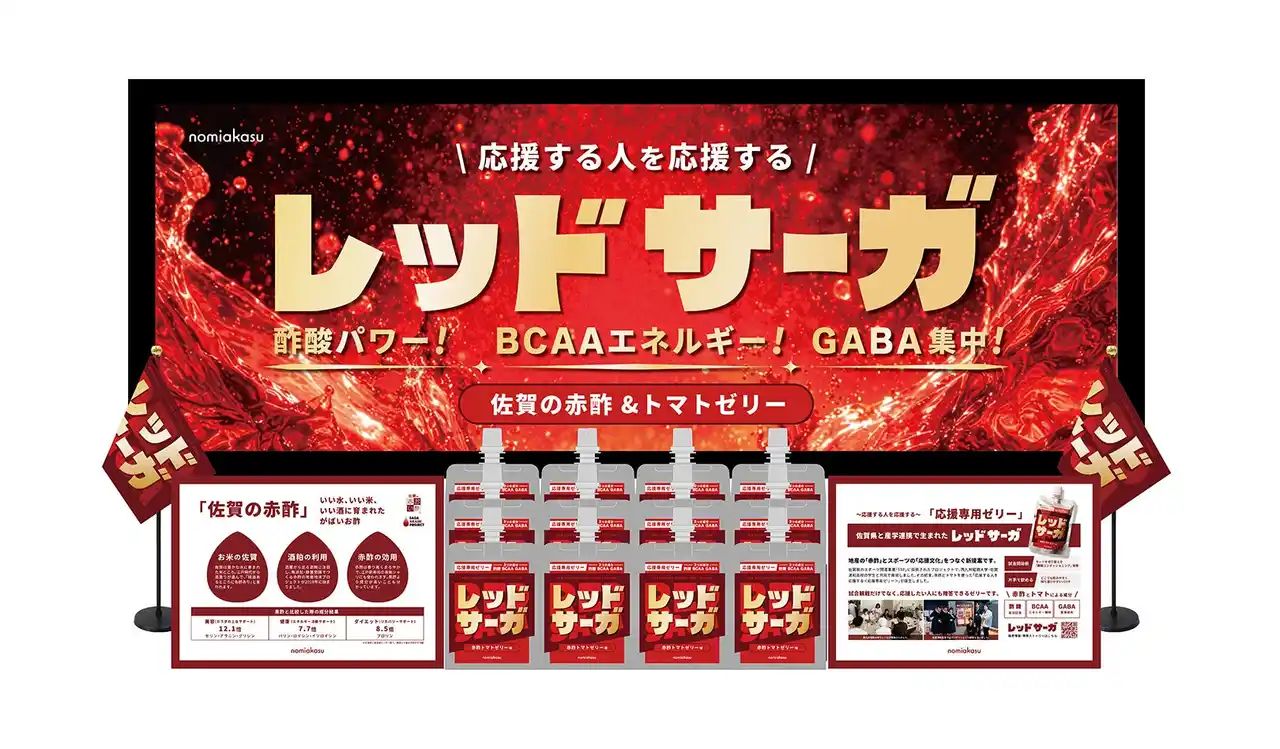 株式会社HONZAN(本社:佐賀県佐賀市、代表取締役:本山 智子)は、佐賀県の地域資源である「酒粕」を有効活用する「佐賀県赤酢プロジェクト」の新たな取り組みとして、産学官連携により開発した“応援専用ゼリー”『レッドサーガ』をローンチいたします。 本商品は、佐賀県のスポーツ関連事業「SSP(SAGAスポーツピラミッド)構想」に採択されたプロジェクトの一環で誕生し、2026年3月22日開催の「さが桜マラソン」にて本格デビューを果たします。 |