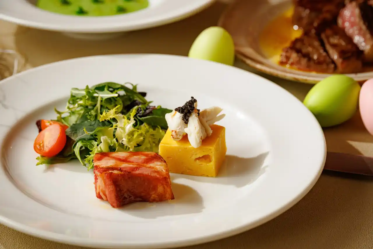 前菜には、イースターの象徴である卵の豊かな風味を生かしたケークサレや、大人のイースターエッグを思わせるクラブミートとキャビアなど、見た目も風味も華やかな「イースターオリジナル前菜盛り合わせ」が登場。