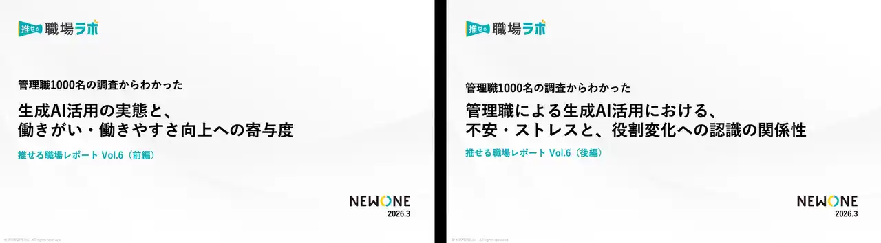 エンゲージメント向上を軸とした組織開発・人材育成コンサルティング支援を通して“推せる職場づくり”を進める株式会社NEWONE(本社:東京都港区 代表取締役:上林 周平、https://new-one.co.jp/ 以下、NEWONE)が運営する「推せる職場ラボ」は、全国の管理職1,000名を対象に「生成AIの活用状況と働きやすさ・働きがいの関係性」に関するアンケート調査を実施しました。 また、本調査の結果をまとめた「推せる職場レポート Vol.6(前・後編)」を本日公開いたしました。 |