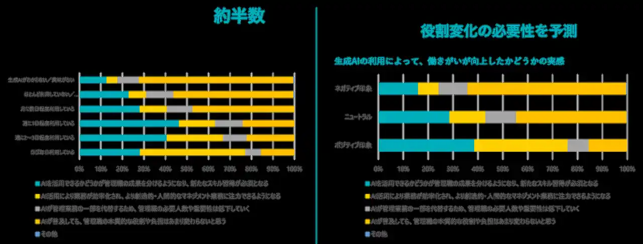 | 生成AIの活用によって「働きがい」が高まる一方で、活用が進むほど新たな不安を感じている管理職も多いことが明らかになりました。 | |||||||||||||||