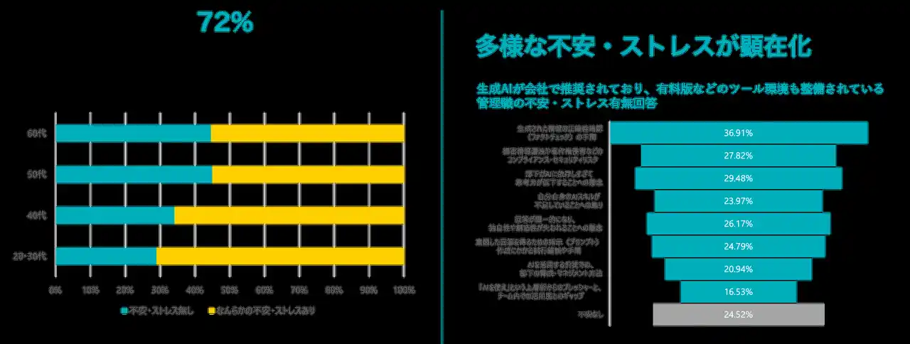 | 特に20・30代管理職の72%がこうした不安を感じており、生成AI導入においてはスキルの習得だけでなく、心理的なサポートや組織としてのガイドライン整備の重要性も浮き彫りとなりました。 | |||||||||||||||
