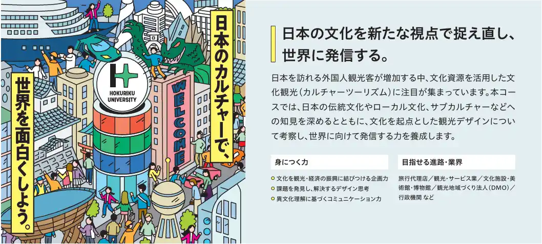 | 3.地域文化情報デザインコース:日本の伝統文化やサブカルチャーへの知見を深め、文化資源を活かした観光デザインを考察し、世界へ発信できる力を養います 。 | |||
