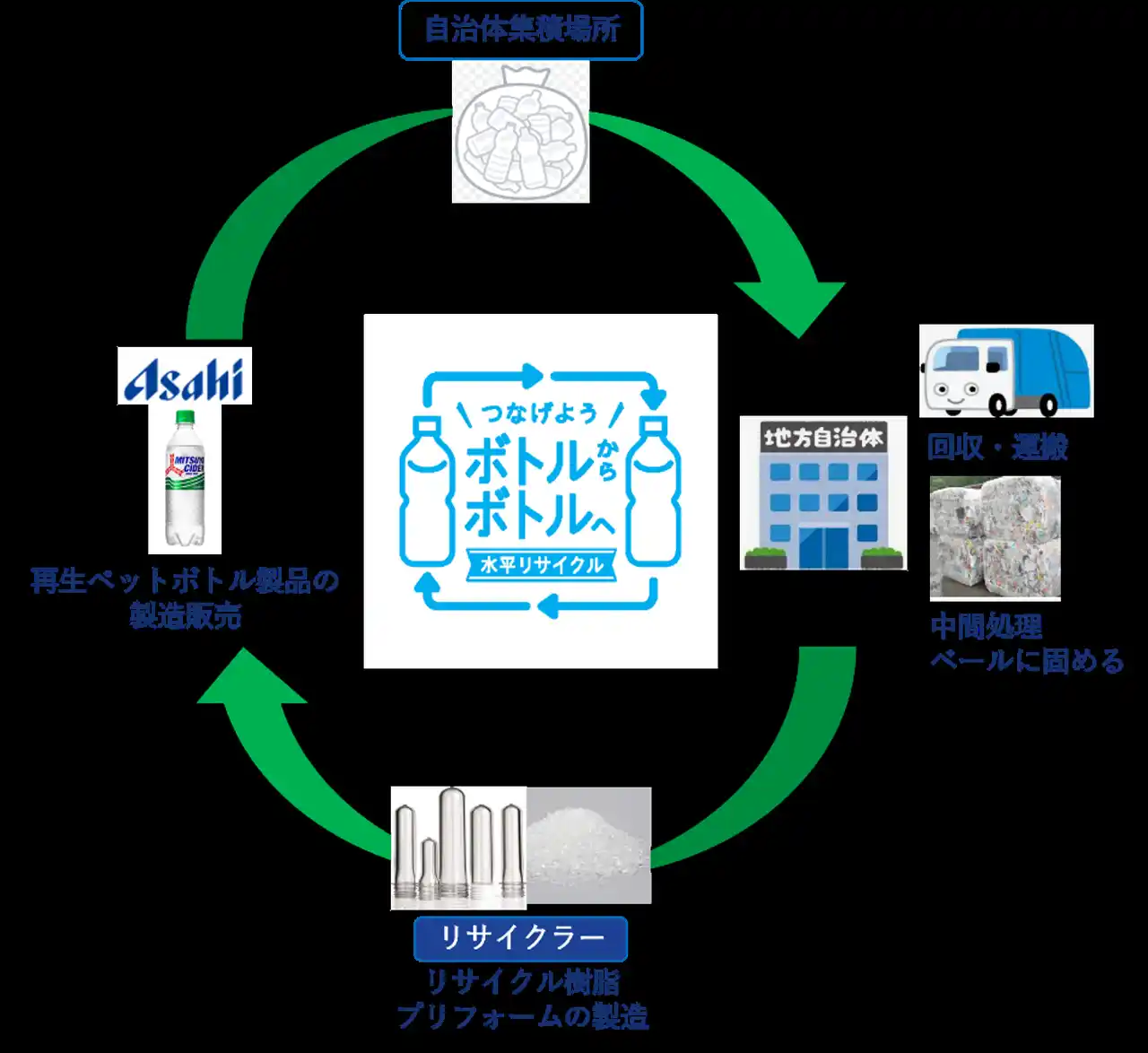 アサヒ飲料は、メカニカルリサイクルとケミカルリサイクルの組み合わせにより、リサイクル率の向上を目指しています。 |