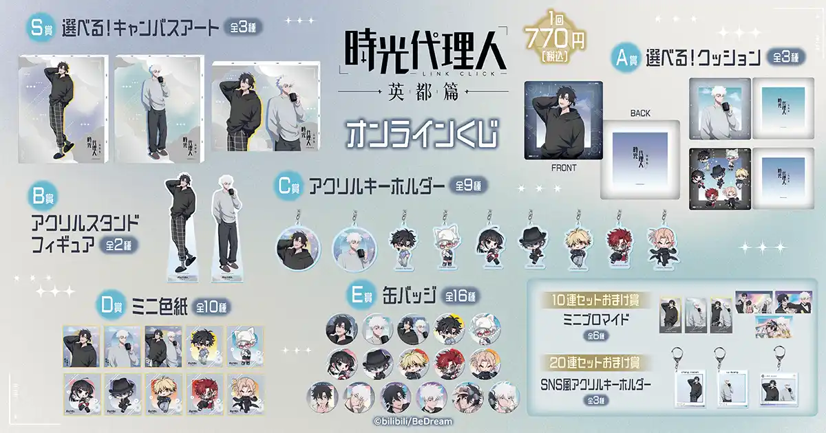 株式会社KADOKAWA(本社:東京都千代田区、取締役 代表執行役社長 CEO:夏野 剛、以下 KADOKAWA)は、運営するオンラインくじサービス「くじ引き堂」において、『時光代理人 -LINK CLICK- 英都篇 -』の豪華賞品が手に入る<時光代理人 -LINK CLICK- 英都篇 オンラインくじ>を、2026年3月24日(火)12時より販売します。 |
