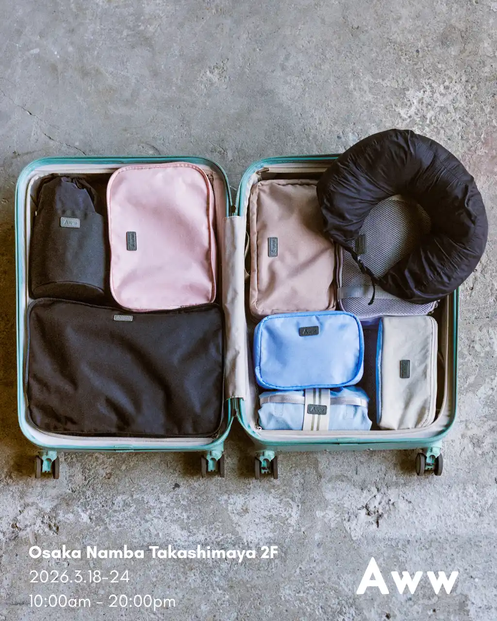 トラベルアイテムを展開するAww(アウ)は、2026年3月18日(水)から3月24日(火)の期間、大阪高島屋2階 旅行用品売場にてポップアップストアを開催いたします。 |