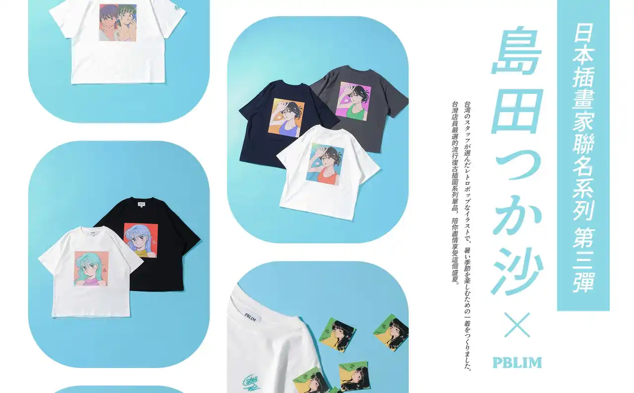 数ある島田つか沙氏の作品の中から、台湾スタッフが厳選したイラストをPBLIMオリジナルの限定カラーへとアップデートし、作品が持つレトロな空気感はそのままに、現代のストリートスタイルに馴染む配色を追求しました。イラストを飾るだけでなく「身に纏う楽しみ」を提案する、特別なコレクションに仕上がっています。 |