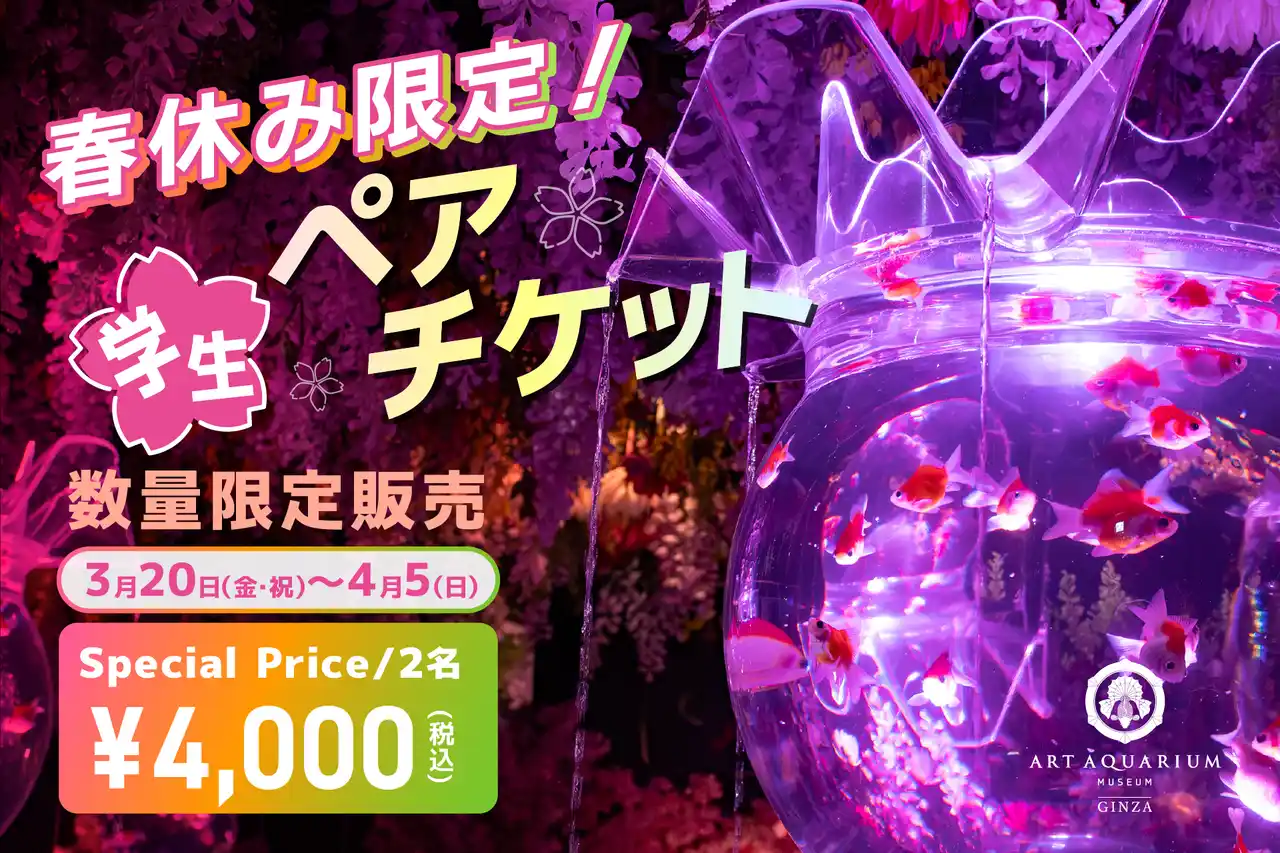 アートアクアリウム美術館 GINZA(所在地/銀座三越)では、 3月20日(金・祝)~4月5日(日)の期間、学生限定の特別価格ペアチケットを販売いたします。 |