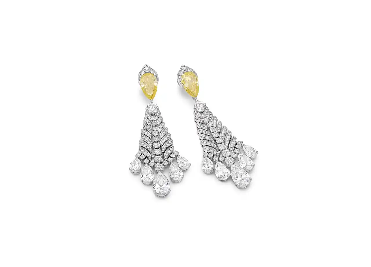 ネックレスに合わせたイヤリングは、ファンシー インテンス イエローダイヤモンドとホワイトダイヤモンドをあしらい、取り外しが可能で、スタッズピアスとしても着用できます。 |