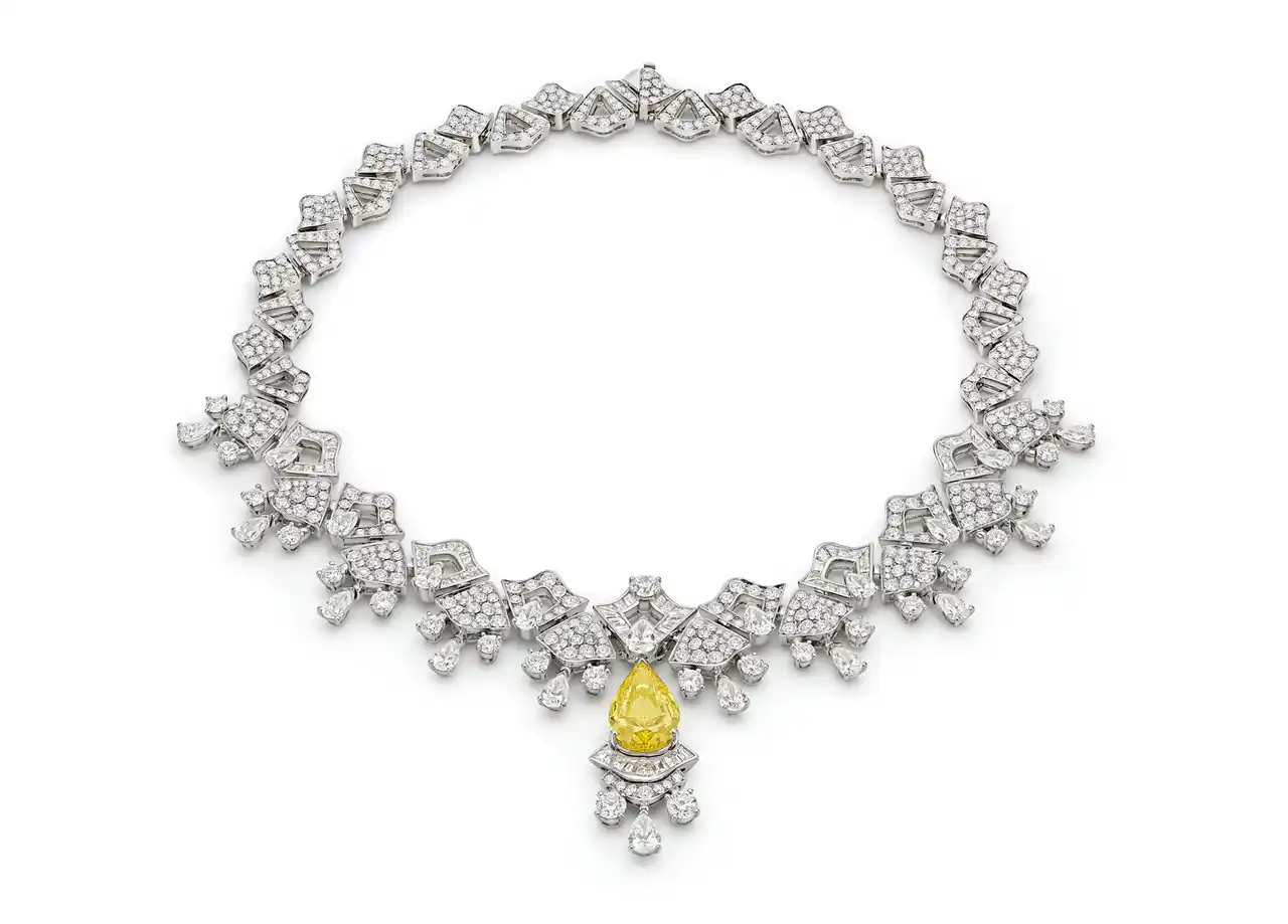 ネックレスの中心には、稀少で均一な色彩分布で高く評価される、並外れた8.02カラットのファンシー ヴィヴィッド イエローダイヤモンドが輝き、その周囲にはペア、ラウンド、ステップカットのダイヤモンドがまるで星のようにちりばめられ、全体のダイヤモンドの総数は35カラットを超えます。その配置は、アントニオ・カノーヴァの彫刻様式が持つ光り輝く純粋さと均衡の取れたプロポーションを想起させます。850時間以上の細心の職人技が生んだこのネックレスは、ヘッドを取り外せる仕様となっており、ブルガリが誇る多様な着用を可能にするハイジュエリーへのこだわりを示しています。 |