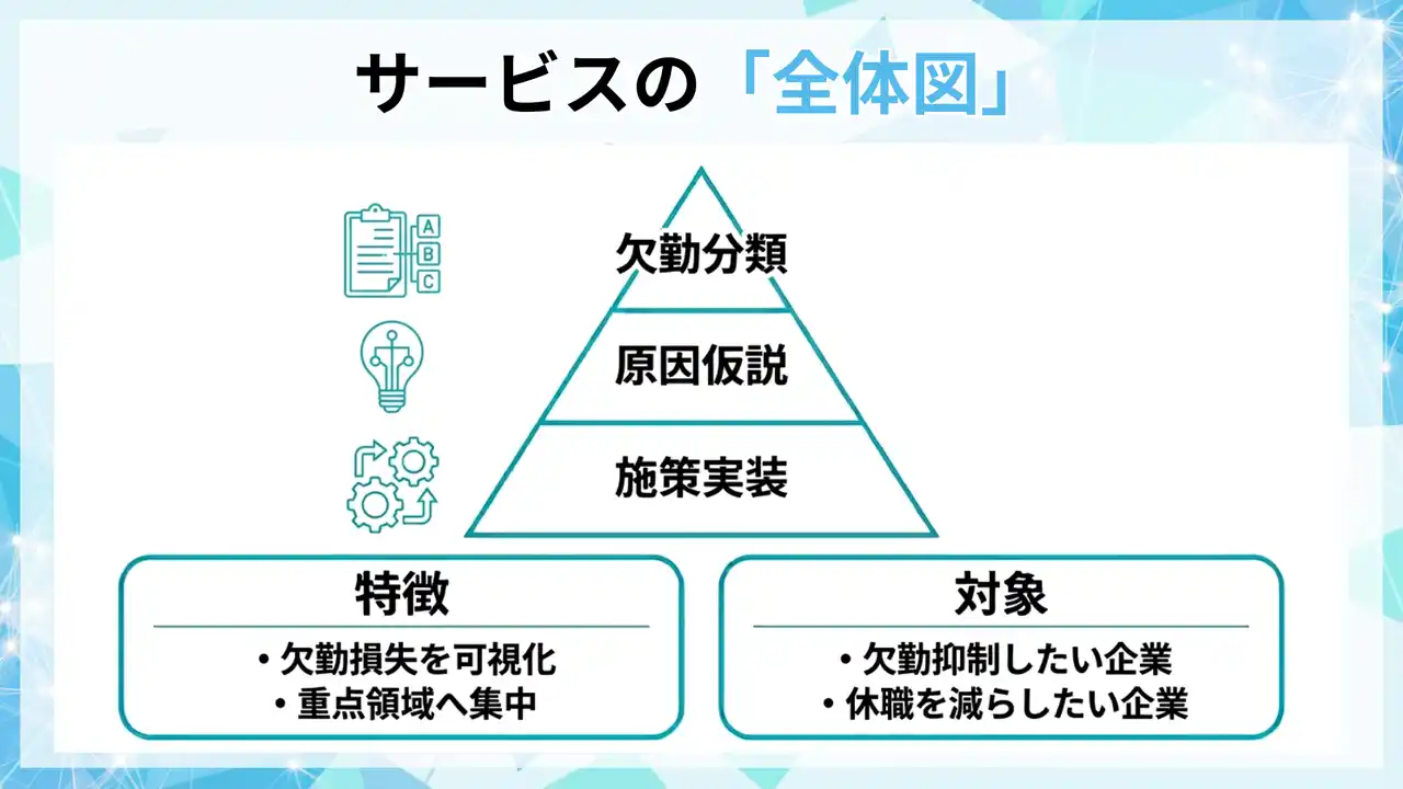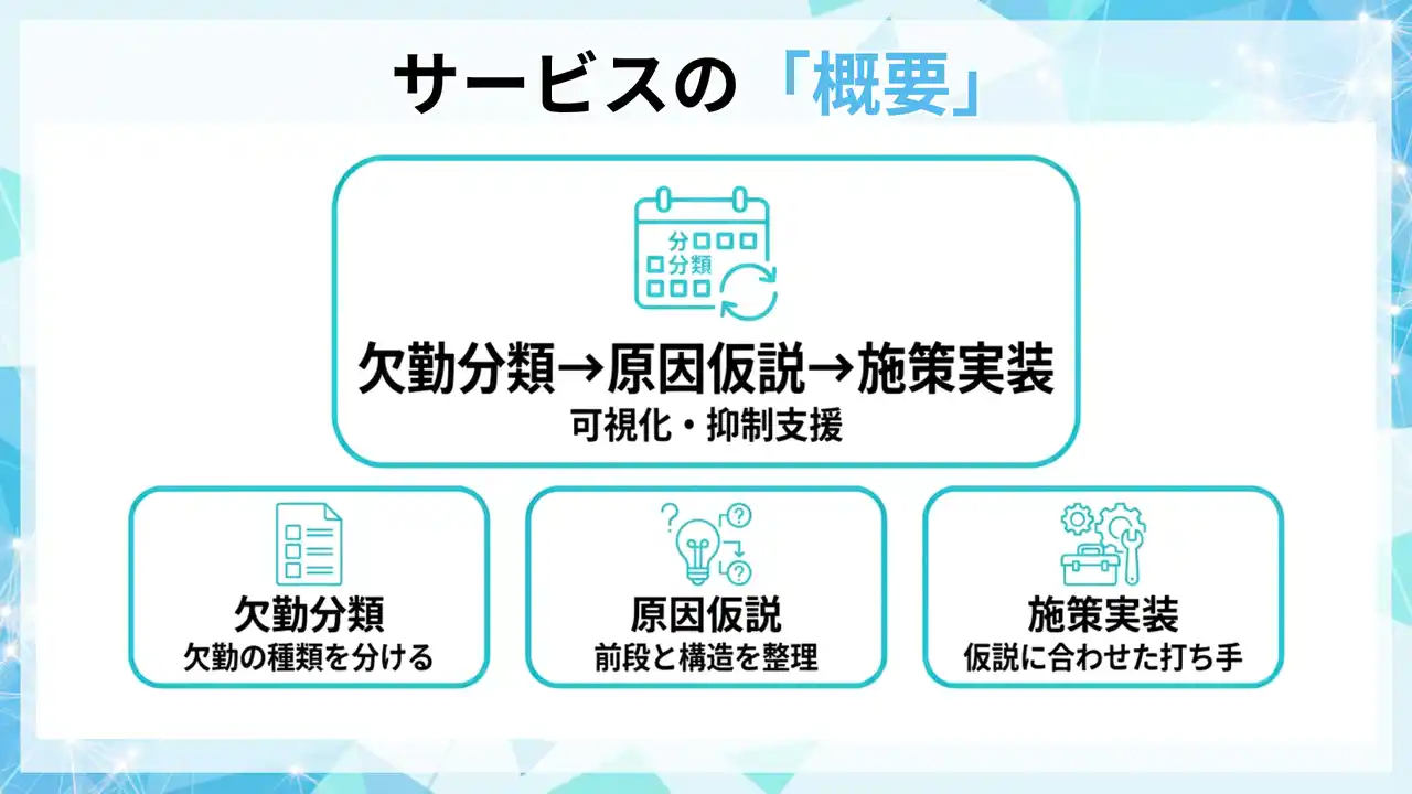 本支援は、欠勤を分類し、仮説と施策をセットで運用することで、欠勤日数・休職者数・復職率の推移で抑制効果を検証します。 |