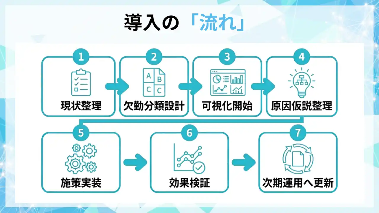 本支援は、欠勤データを「分類→仮説→施策→検証」の運用に落とし込み、欠勤損失を抑制するための実務プロセスを整備します。 |