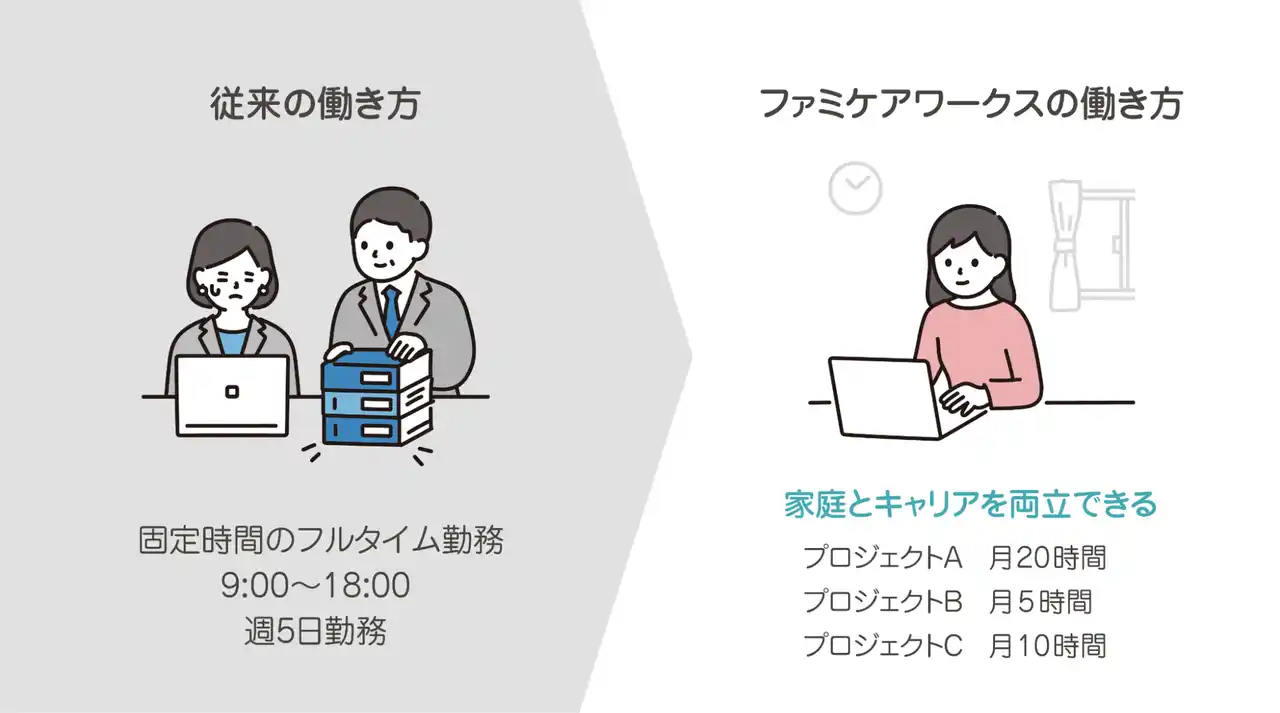 ファミケアワークスは、事務、秘書、ディレクション、マーケティングなどの実務経験を持つ人材が、それぞれの経験やスキルを活かして仕事に関わる新しい形のプロジェクト型ワークサービスです。 |