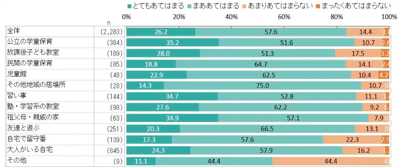 子どもの自己肯定感(自分のことが好きだ)について、全体では83.8%が肯定回答(とてもあてはまる+まああてはまる)。メインの放課後の過ごし方別にみると、「祖父母・親戚の家」が最も高く92.1%、次に「塾・学習系の教室」が89.8%となっており、「放課後子ども教室」(79.4%)と「自宅で留守番」(74.8%)が全体を下回っています。 |