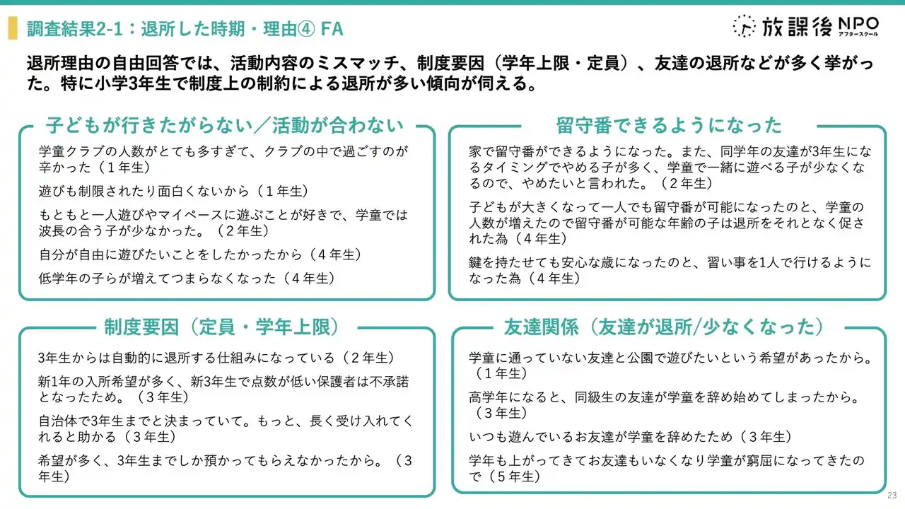1.公立の学童保育退所時期は小学3年生が最多(32.9%)、1年生の4-6月にも1割程度の退所が発生。「子どもが行きたがらなくなった」が最大の理由。活動内容・音環境・選択性に改善余地があり、過ごし方の“質”が伴わなければ安定的な居場所として機能しにくい。併せて、定員拡充・学年上限の運用改善が必要。