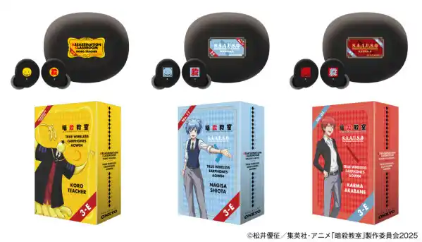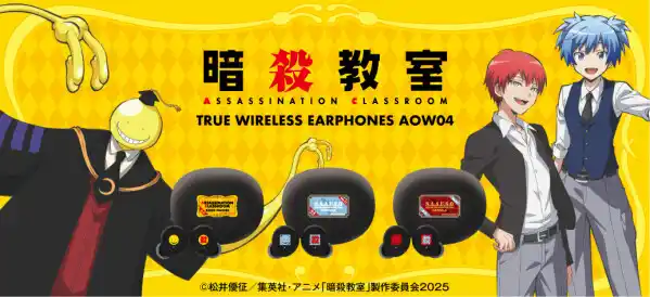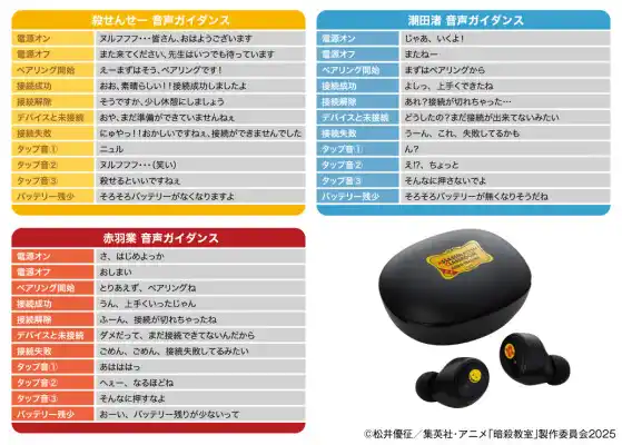 音声ガイダンスは「殺せんせー(CV:福山潤)」、「潮田渚(CV:渕上舞)」、「赤羽業(CV:岡本信彦)」の録り下ろしボイスを搭載。電源オンやオフ、ペアリング時やタップ音等、各モデル全11ワードの豪華内容となっております。