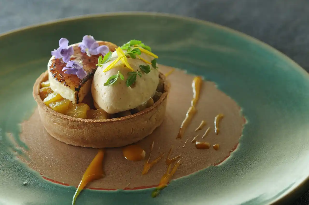| 春に旬を迎えるピーチパインをソテーした上に、沖縄で親しまれている「さんぴん茶」の香るクレームシブーストと黒糖のアイスクリームを重ねた、見た目も味わいも華やかな一品です。酸味が少なく甘みの強いピーチパインは、香り高いジャスミンと相性が良く、コースの最後を軽やかに締めくくります。 | |||||||||