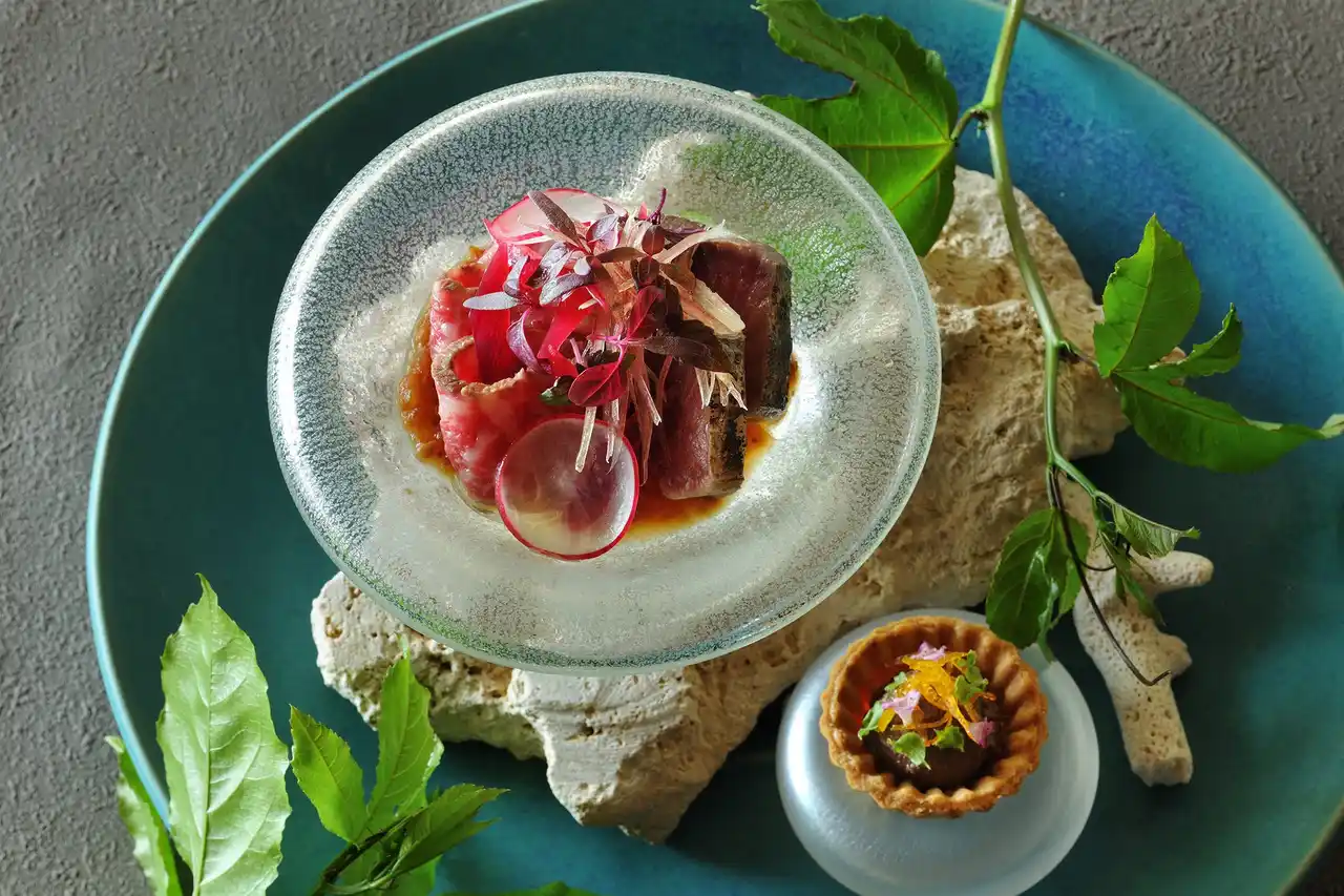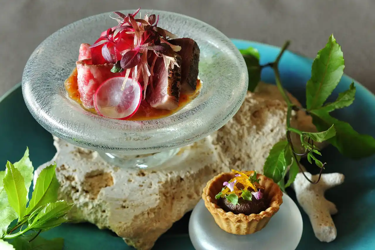 | 春に旬を迎える鰹と牛肉のたたきにハーブのサラダと焼きトマトのソースを合わせ、華やかで軽やかな味わいに仕立てました。ミキュイの断面やハーブ、焼きトマトのソースの鮮やかな赤色は、春に満開を迎える「デイゴ」の花を思わせます。リエットにはカツオの血合いを余すことなく使い、ソースやアクセントに竹富島醤油を使うなど、旬の食材と島に伝わる調味料の調和を堪能できる一品です。 | |||||||||